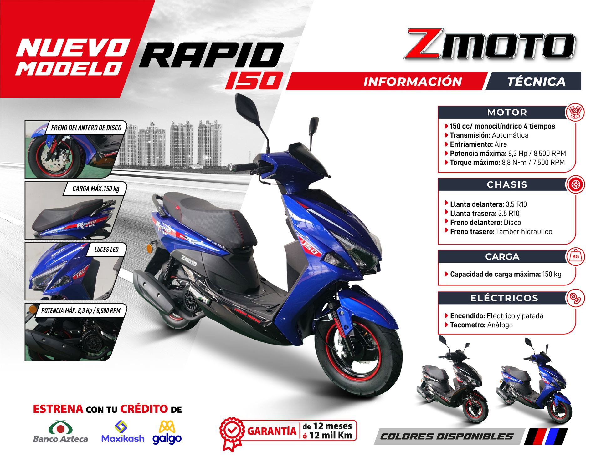Descubre la motoneta perfecta que te llevará a tu destino con eficiencia y estilo. La Rapid 150 cuenta con un potente motor de gasolina de 150 cc y transmisión automática, ofreciéndote una potencia máxima de 8,3 Hp a 8,500 RPM. Con su diseño mejorado, esta motoneta te garantiza llegar a donde necesitas con comodidad y confianza. ¡No te arrepentirás de elegir la Rapid 150 como tu compañera de viaje!