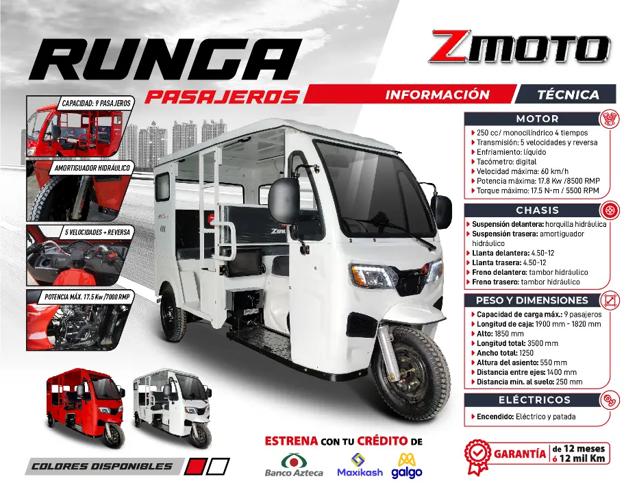 La Runga Pasajeros cuenta con más espacio para el conductor y los pasajeros, diseñada para llevar hasta 9 personas cómodamente. Tiene un motor monocilíndrico 250cc, enfriamiento líquido, encendido eléctrico y de patada cuenta con 5 velocidades más reversa.